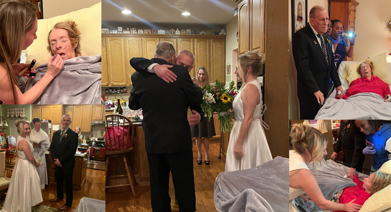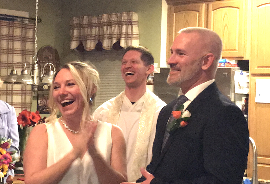 Because it was important to the youngest Seith sibling, Andrea, that her mom be at her wedding, the fiancés decided to forgo their original plans for a storybook wedding in the Fall and step into action. With the help of Fr. Chris, and through the grace of God, we celebrated the marriage of Andrea and Matt within 48 hours after the thought crossed their minds. There’d be no grand wedding every bride imagines. There’d be no huge reception to celebrate with their myriads of friends. And there’d be no picture-perfect nuptials in the Baltimore Cathedral. Instead, as Gail lay dying in her makeshift hospital/family room, Bob, together with Matt’s parents and sisters, and the Seith siblings and wives, we witnessed and celebrated self-giving love, as Matt and Andrea became husband and wife. It was beautiful! What shone, other than the intense love of these two for each other, was the love and unity that God deigned for families to live in. Dropping everything, including their own desires and plans, both sides of the family came together in familial love to make this wedding not only happen, but more importantly, it became what weddings and marriages should be – a beautiful expression of true love which surpasses understanding.